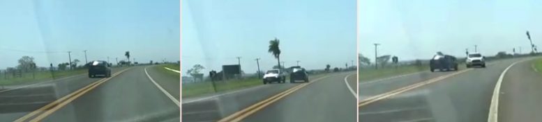No vídeo, o carro do suspeito primeiro invade o acostamento. Momentos depois, ele cruza a pista e percorre um bom trecho na contramão.