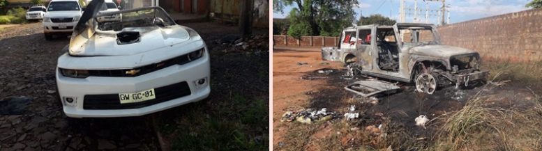 Minutos depois no cruzamento das ruas Jovens pela Democracia com Cerro Leon foi encontrado queimando o Jeep Unlimited Rubicon, placa XAR-863, do Paraguai. O carro está em nome de um homem de 51 anos, morador em Hernandárias, nas proximidades de Ciudad del Este. O último carro que foi destruído foi o Camaro, placa GWGC-81, do Chile. Ele foi queimado no cruzamento das ruas Ytororó com Adélia Speratti, no Bairro Santo Antonio.