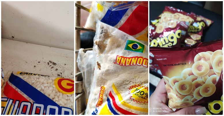 Segundo a equipe, o que mais chamou a atenção foi presença de insetos que andavam dentro dos pacotes de produtos expostos nas gôndolas, colocando em risco a saúde do consumidor.