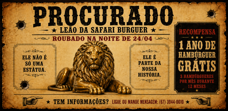Uma estátua de leão furtada em Campo Grande virou o centro de uma campanha inusitada: a promessa de hambúrguer grátis por um ano para quem ajudar a recuperá-la.