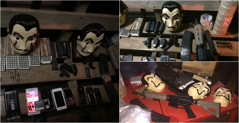 Investigadores da Direção de Investigações de Casos Puníveis da Polícia Nacional do Paraguai apreenderam, em Pedro Juan Caballero, cidade paraguaia que faz fronteira com Ponta Porã (MS), diversas máscaras semelhantes às usadas na série “La Casa de Papel”, da Netflix, e um verdadeiro arsenal de guerra, que inclui fuzil, pistolas, munições, colete a prova de balas e até aparelhos celulares.