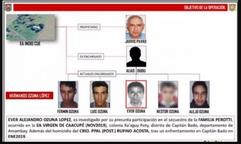 O chefe antissequestro afirmou que Ever Alejandro conta com cinco mandados de prisão, por homicídio, roubo e tráfico de maconha. Foragido do presídio de Concepción, é investigado também pelo sequestro da família Perotti, naquela mesma região do Paraguai, em novembro do ano passado.